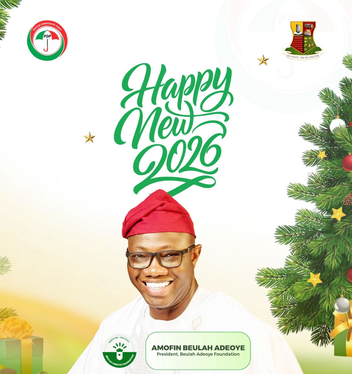 Amofin Beulah Adeoye, president of the Beulah Adeoye Foundation has extended his warmest greetings and best wishes to the good people of Oyo State and Nigeria as a whole for new year 2026.