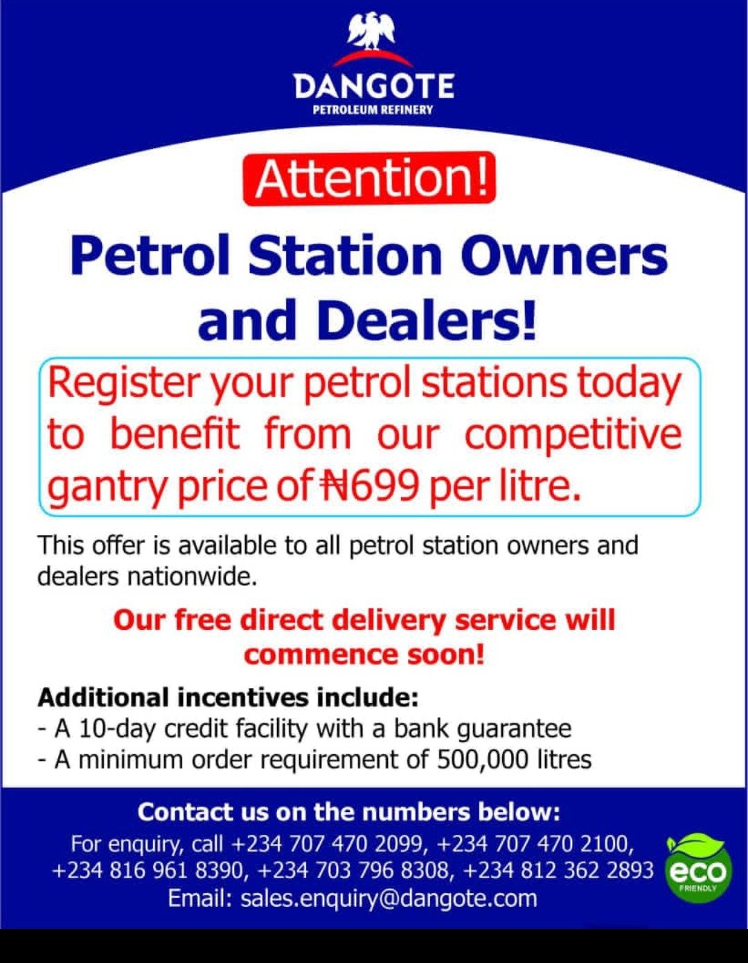 In a notice addressed to petrol station owners and marketers, the refinery urged operators nationwide to register their stations to benefit from the competitive pricing, which is open to all licensed dealers.