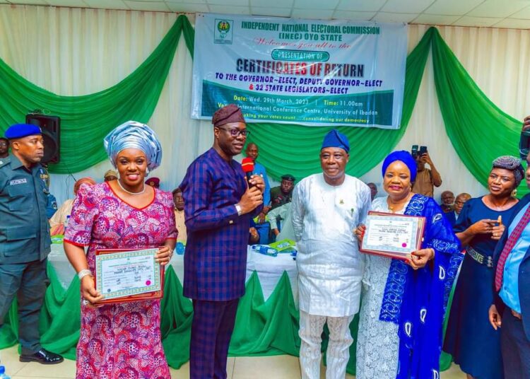 Oyo State governor, ‘Seyi Makinde, his deputy, Barr. Abdulroheem Bayo Lawal and the 32 Oyo House of Assembly members-elect, on Wednesday, received their Certificates of Return from the Independent National Electoral Commission (INEC).