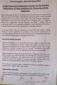 The opposition leaders also specifically accused the EFCC of being “weaponised” against opposition figures, alleging a discernible pattern of selective prosecution aimed at weakening the opposition for the benefit of the ruling All Progressives Congress (APC).