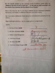 The statement, dated December 14, 2025, was signed by former Senate President, Senator David Mark; former Vice President, Alhaji Atiku Abubakar; Mallam Lawal Batagarawa; Chief Bode George; former Anambra State Governor, Mr. Peter Obi; and former National Chairman of the Peoples Democratic Party (PDP), Chief John Odigie-Oyegun.